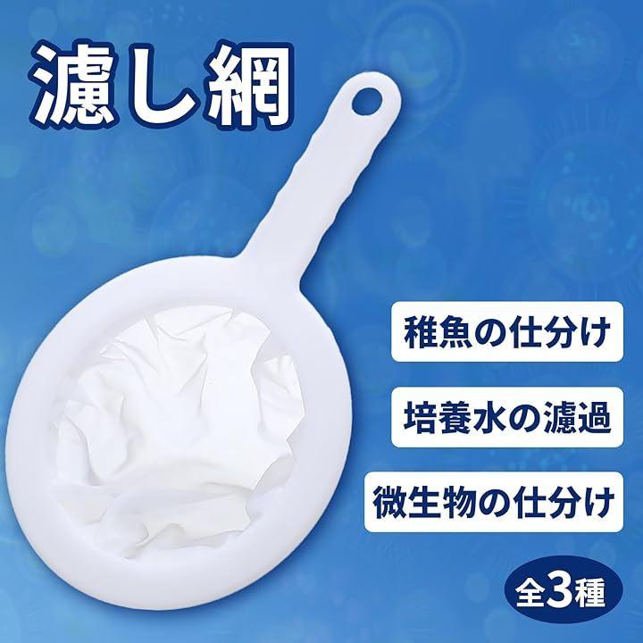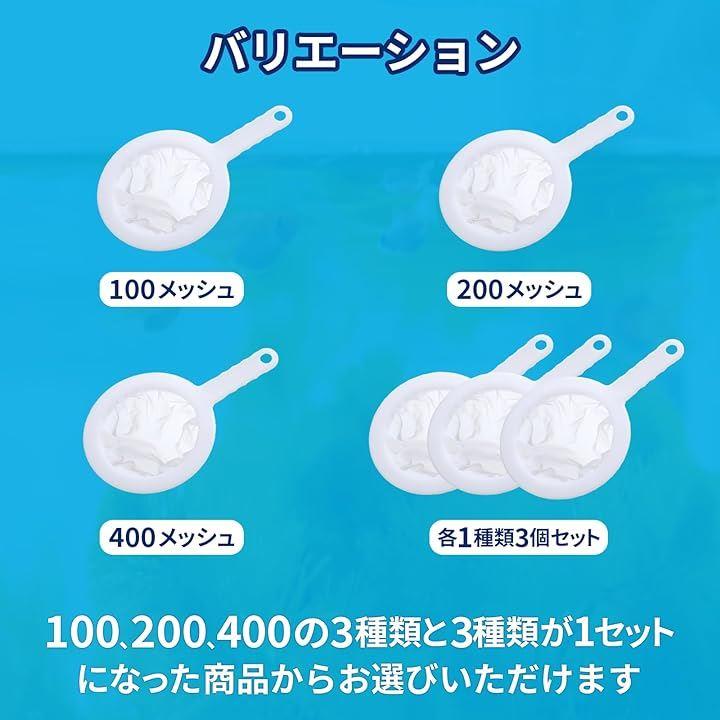 100メッシュはミジンコ、200メッシュはブラインシュリンプ、400メッシュはゾウリムシなどを濾すのにおすすめです。