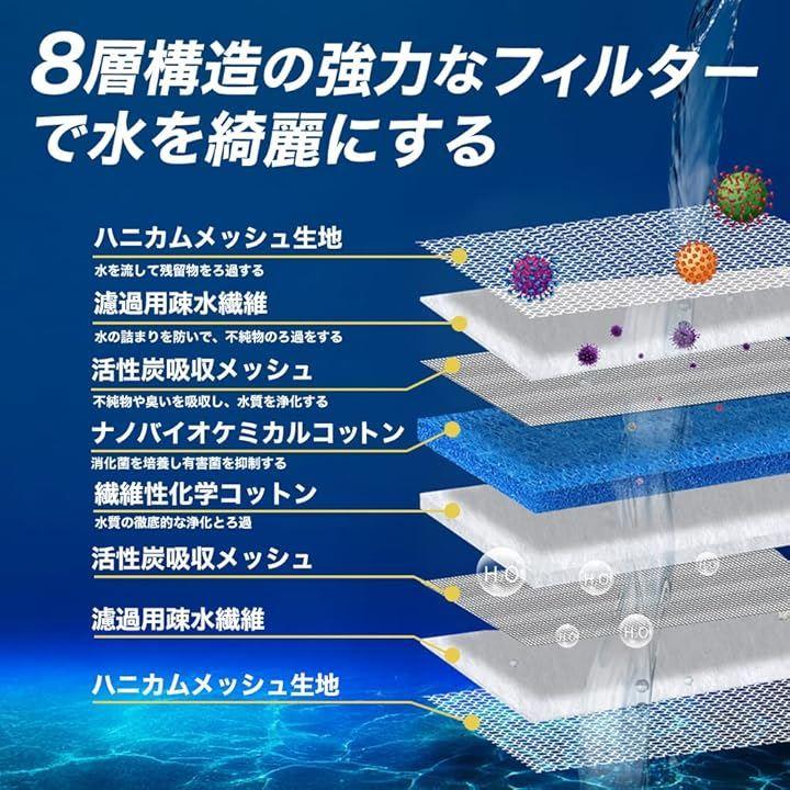 8D立体繊維構造が水中のゴミや食べ残しをしっかり捕捉し、水の透明度を長く維持します。