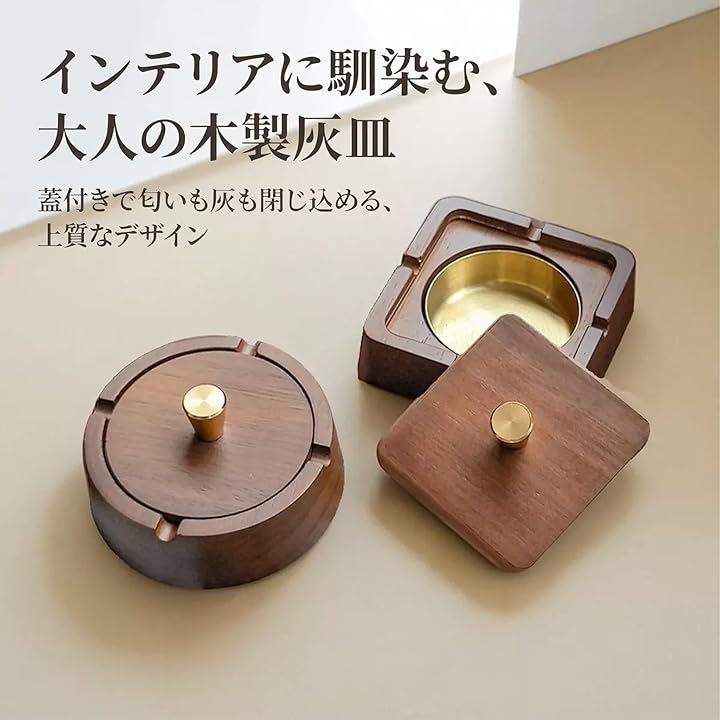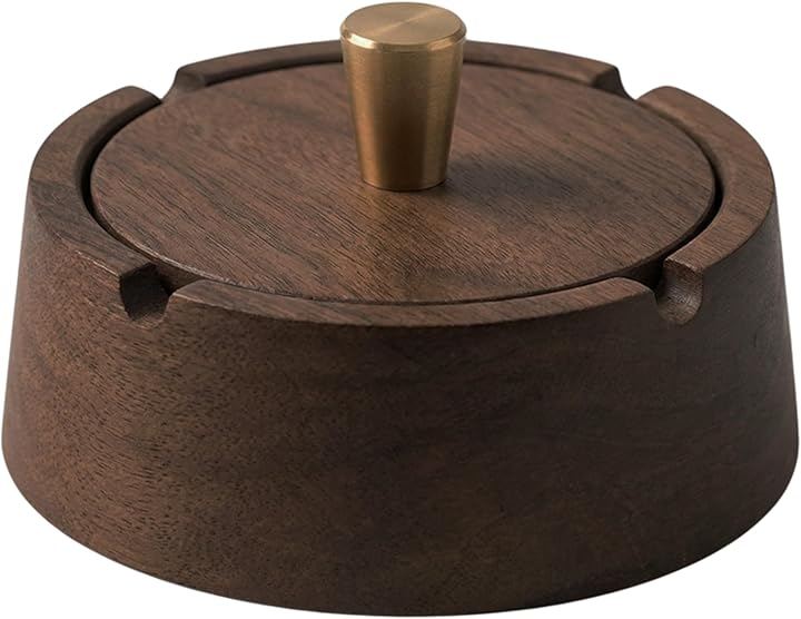 「インテリアに馴染む上質木製灰皿」天然木の温もりと真鍮の輝きが調和した、大人のための蓋付き木製灰皿。