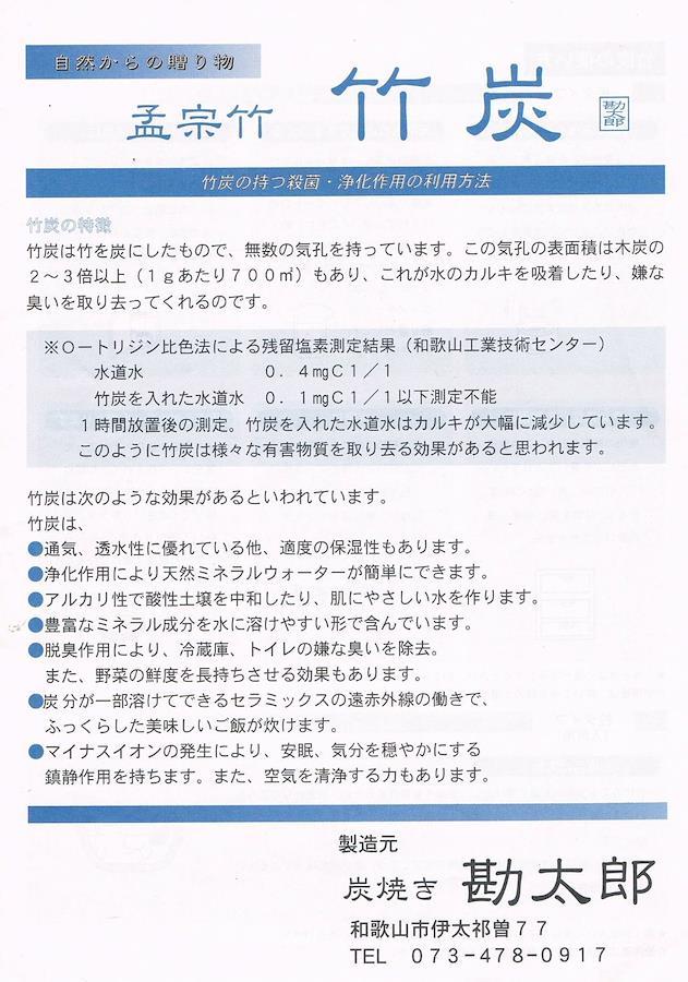炭は、古くから水の濾過器などにも使われてきましたが、竹炭ブームで、炊飯に用いてご飯の味を良くしたり、飲料水の水質改善にも多く使われています。水道水の塩素なども瞬時に削減しますし、発がん性物質であるトリハロメタンも吸着します。竹炭が多くのミネラルを含んでいることも良く知られており、竹炭を入れるだけで簡単に美味しいミネラル水ができます。