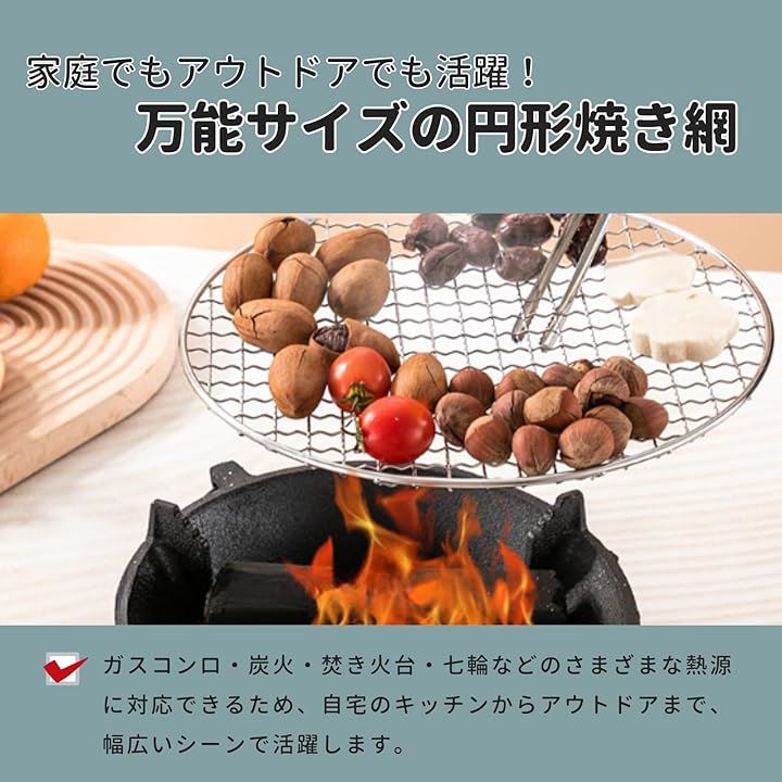 「家庭でもアウトドアでも活躍。万能サイズの円形焼き網」焼き鳥や海鮮、野菜、お肉など、複数の食材を一度に並べて焼ける使い勝手の良い円形焼き網。