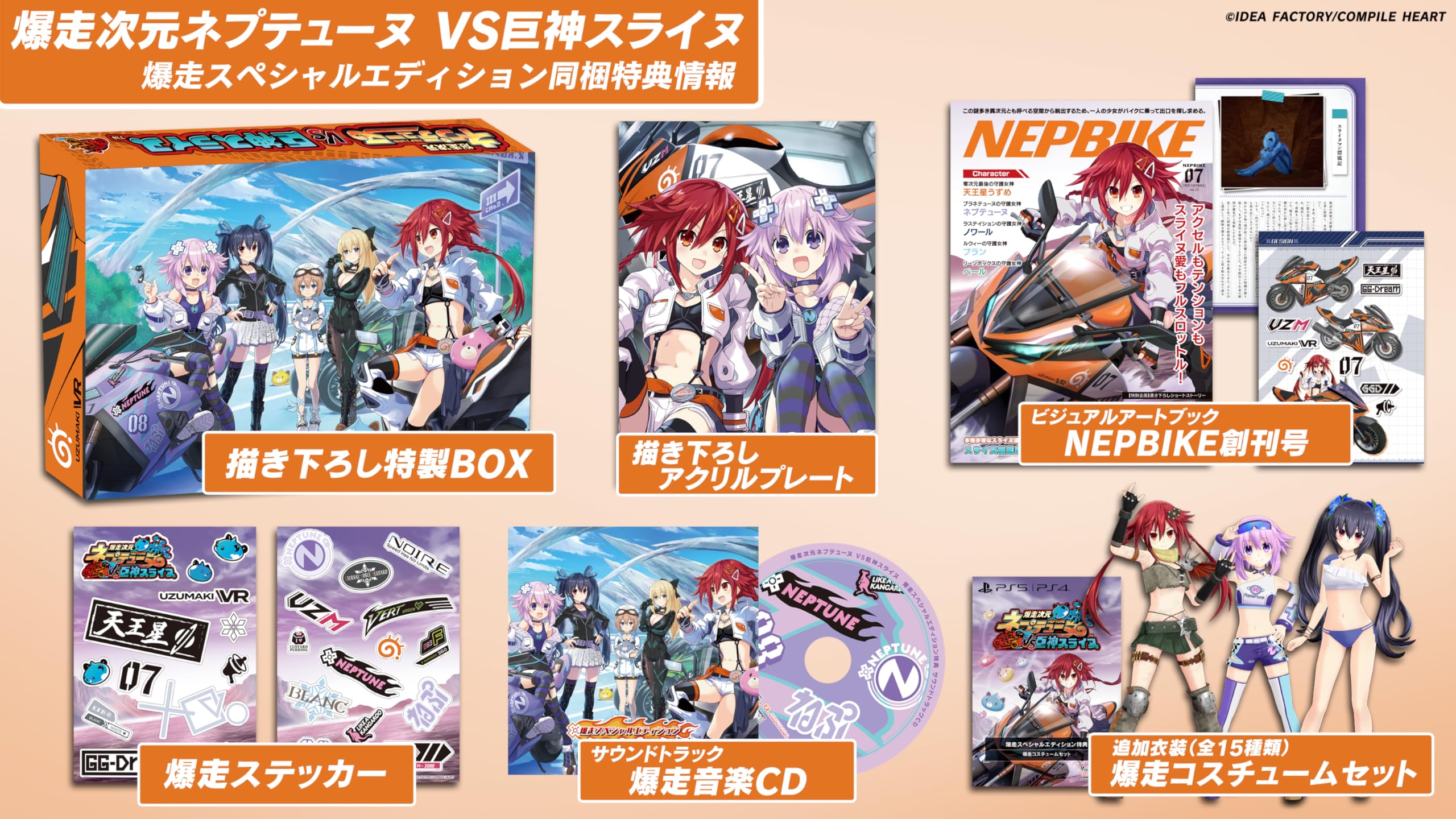 爆走次元ネプテューヌ VS巨神スライヌ 爆走スペシャルエディション -PS4 【特典】ビジュアルアートブック「NEPBIKE創刊号」、サウンドトラック「爆走音楽CD」、爆走ステッカー、描き下ろし爆走アクリルプレート、DLC「爆走コスチューム