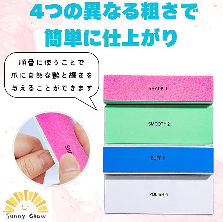「 4つの異なる粗さで簡単に仕上がり」粗さの異なる4つの面で構成されており、それぞれを順番に使うことで、爪に自然な艶と輝きを与えることができます。