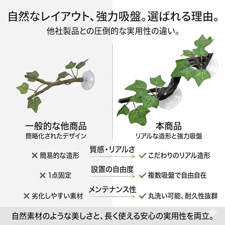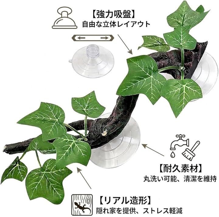 「吸盤式で自由自在なレイアウト」 強力な吸盤が付属しており、ガラス面やケージの側面・上面など、お好きな場所へ簡単に固定できます 。