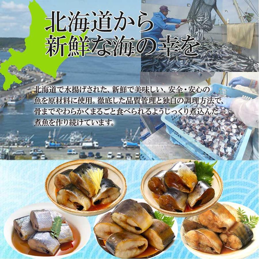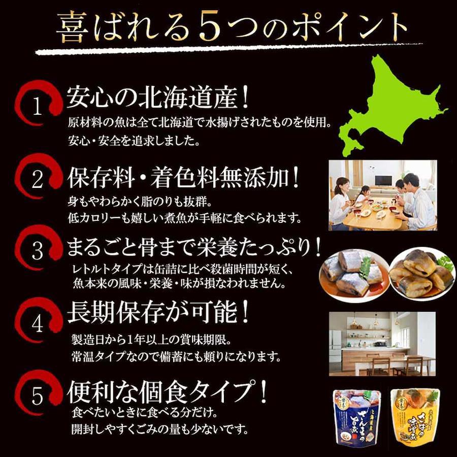 栄養たっぷりのまるごと骨まで食べられるレトルト煮魚シリーズ!缶詰に比べ殺菌時間が短く、魚本来の風味、栄養、味が損なわれません。開封もしやすく、ゴミの量も少ないです。魚はすべて北海道産100%!根室で水揚げされた魚を直接市場から買付けし、製造加工まで全て自社でおこなっております。保存料・着色料不使用!身もやわらかく脂のり抜群!低カロリーで嬉しい煮魚10食分!商品内容:さんまの旨煮(95g)いわしの旨煮(95g)いわしの生姜煮(95g)さばの味噌煮(120g)ほっけの旨煮(80g)各2パック 漁師のお味噌汁1食賞味期限:常温で7か月以上 ※高温、直射日光を避けて保管してください【重要】メーカーによる商品リニューアルに伴いパッケージ(内容量も含む)変更が行われた場合、新パッケージでお届け致します事ご了承願います。