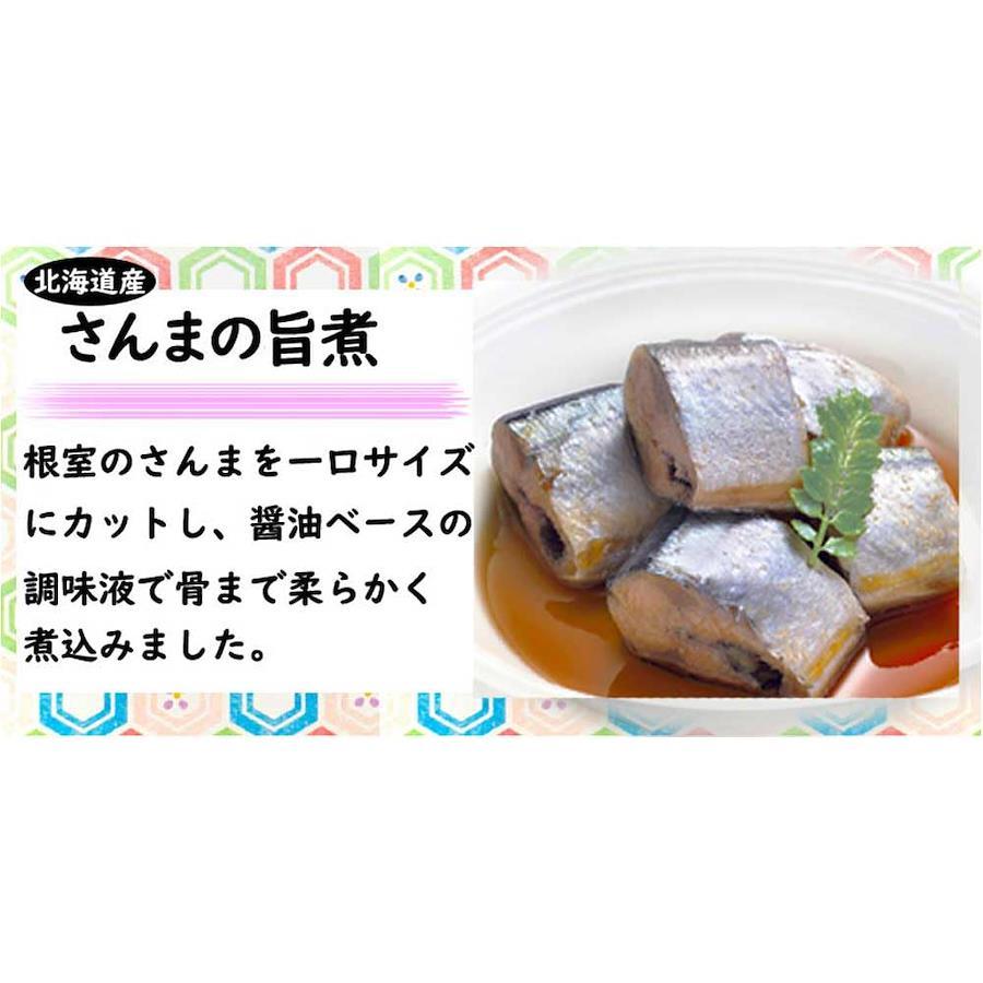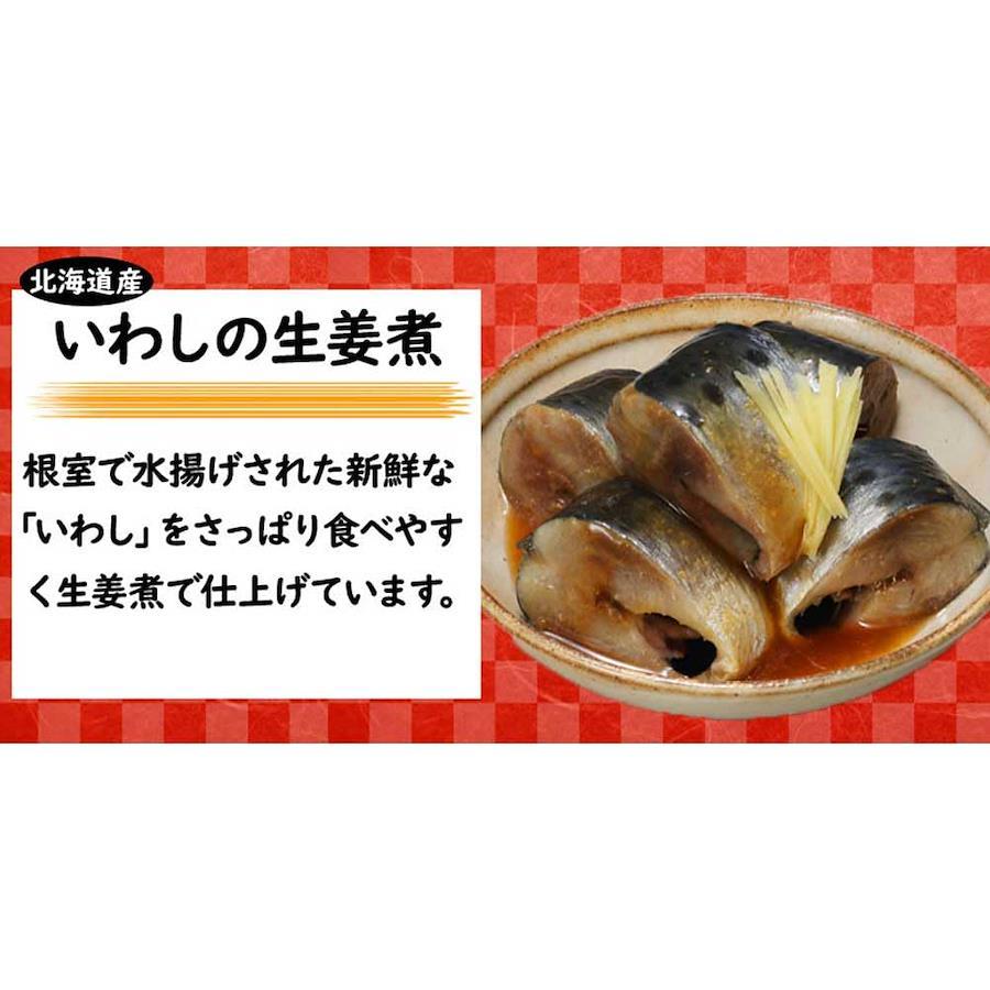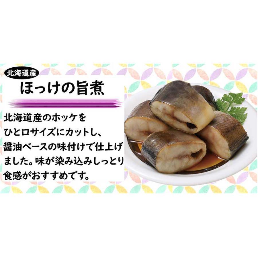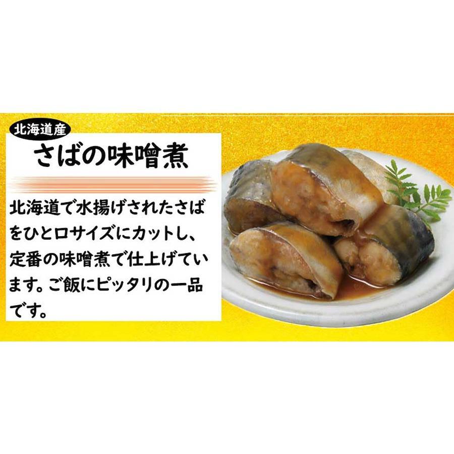 【さばの味噌煮】さば(北海道)、砂糖、味噌、味醂、(一部にさば・大豆を含む) 【さんまの梅酢煮】さんま(北海道)、砂糖、食塩、米発酵調味料、梅酢、醸造酢、酵母エキス/調味料(アミノ酸等)、酸味料、香料 【ほたての水煮】ほたて(北海道)、食塩 【いわしの生姜煮】いわし(北海道)、砂糖、醤油、食塩、生姜、酵母エキス、唐辛子、ガーリックパウダー/調味料(アミノ酸等)、酸味料、増粘多糖類、(一部に大豆・小麦を含む) 【ほっけの旨煮】ほっけ(北海道)、砂糖、醤油、水飴、味醂、昆布エキス、食塩、(一部に小麦・大豆を含む)