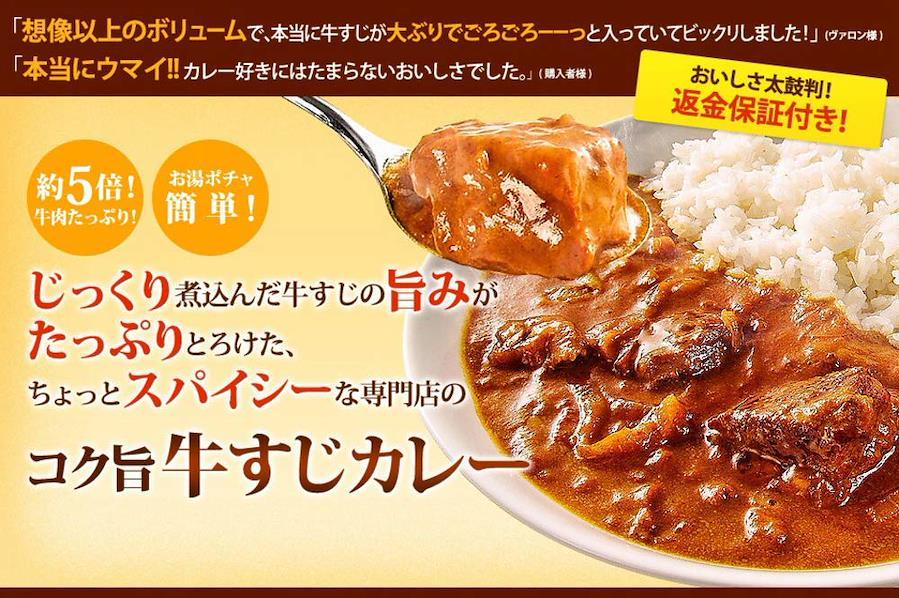 おいしさ、まるごと急速冷凍。通常の約5倍の牛肉を使用!じっくり煮込んだ牛すじの旨みがたっぷりとろけた、ちょっとスパイシーな専門店のコク旨牛すじカレー!とろ~っと、牛すじとろけるルーに、ごろっと、角切りビーフが入って、味もボリョームも大満足!我が家のカレーの定番が変わるかも・・・?!当店の商品は、この牛すじカレーだけ。味に自信があるので、返金保証をつけております!1パック食べて、もし美味しくないと思ったら残りの商品を返品していただくことで全額返金いたします。 渾身の牛すじカレーを、どうぞ、安心してお試し下さい。