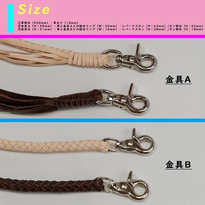 ・「サイズ(詳細)」:(1)革部分(500mm)・革太さ(10mm)、(2)金具A(H:58mm)・革と金具Aとの結合リング(W:20mm)・レバーナスカン(H:43mm)/カン部分(H:22mm)、(3)金具B(H:51mm)・革と金具Bとの結合リング(W:16mm)・レバーナスカン(H:38mm)/カン部分(H:18mm)