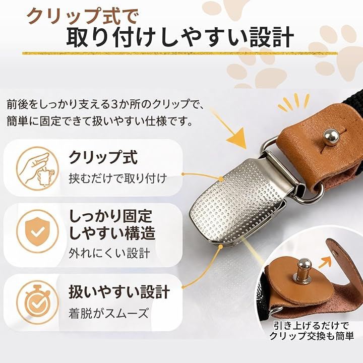 機能性を重視しつつ見た目にも配慮した設計で、ペット用サスペンダーとして使いやすい仕様です。