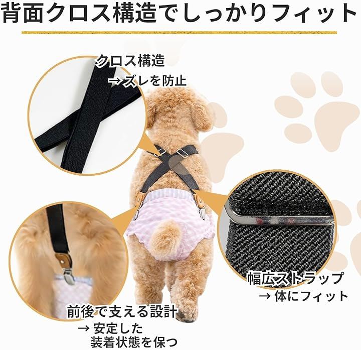 室内でのマーキング対策、ヒート期間のケア、シニア犬の介護など、日常の様々なシーンで活用しやすいドッグ用サスペンダーです。
