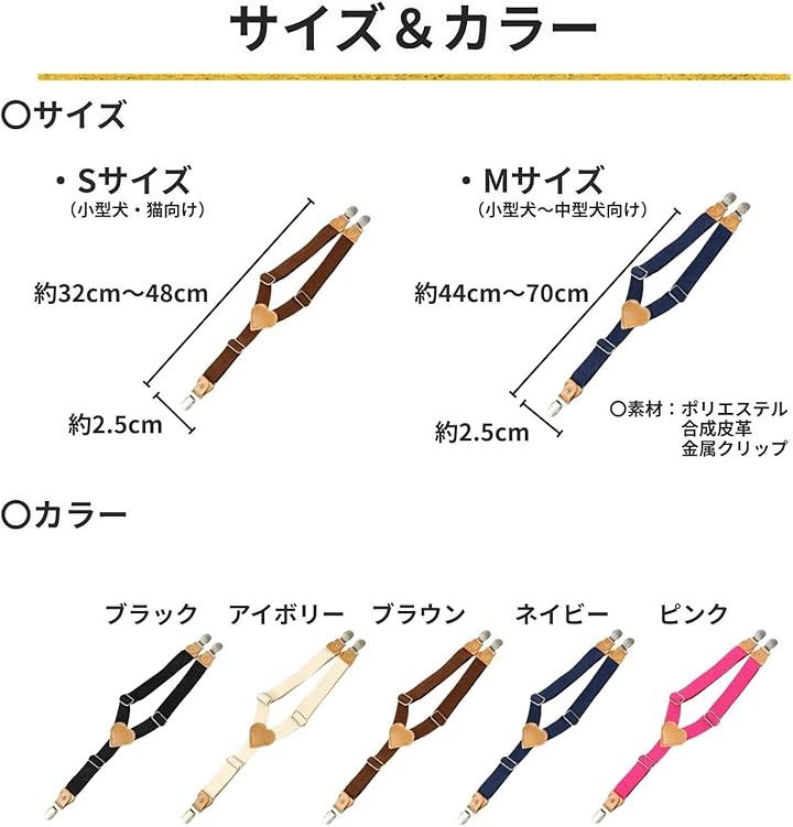 〇サイズ:Sサイズ(小型犬・猫向け)> 幅 約2.5cm / 長さ 約32cm~48cm(調節可能)、Mサイズ(小型犬~中型犬向け)> 幅 約2.5cm / 長さ 約44cm~70cm(調節可能)。