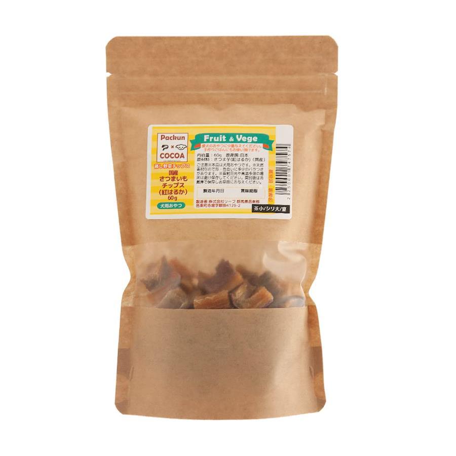蒸して甘みを引き出したパリパリの野菜チップス国産の野菜をふっくらと蒸して甘みを引き出した後にじっくり低温乾燥させたワンちゃん用の野菜チップスです。無添加・無着色・保存料不使用なので安心。全てハンドメイドでていねいに仕上げました。パリッとした食感と甘みでヘルシーながらも満足できるおやつです。PackunxCOCOAfruit&vege蒸し野菜チップス国産さつまいもチップス(紅はるか)60g対象全犬種機能おやつライフステージオールステージ(生後6ヶ月以上)「PackunxCOCOA」コンセプトたくさんの素材をグルメなココアが試食。その中からココアのお気に入りのおやつを厳選しました。ココアお墨付きのおいしさ「PackunxCOCOA」です。特長●紅はるかはしっとりと舌触りが滑らかなで上品な甘さが特長的なさつま芋です。●ワンちゃんが食べやすく食感の残る大きさにカットしてあるのでご飯のトッピングなどにもこのまま使えてお手軽です。●ふっくらと蒸して甘みを引き出した後にじっくり低温乾燥させ、パリパリの食感に仕上げました。●野菜素材なのでヘルシー。●無添加・無着色・保存料不使用です。●味付けはしておりません。素材本来の味をお楽しみください。●保存に便利なチャック付き袋に入っています。●窒素ガス充填パックなので新鮮なままお届けします。(窒素ガスを充填しているため袋が膨らんでいます。)内容量60g原材料さつま芋(紅はるか)(国産)原産国日本与え方●愛犬のおやつとして少量与えてください。●手作りごはんにもお使いいただけます。保存方法●直射日光や高温多湿の場所を避けて保存してください。●開封後は必ず封をして冷蔵庫で保存し、消費期限に関わらず早めにお与えください。ご注意※6ヶ月未満の幼犬には与えないでください。※天然素材なので、形・色合いに多少のバラつきがあります。※本品を与える際は、喉に詰まらせないよう様子を見ながら与えてください。※すぐに召上らない場合は、冷蔵、冷凍で保管してください。※本品は保存料を使用しておりません。消費期限内でも保管状況によっては、カビが発生する場合がございます。開封後は冷蔵庫で保存しお早目にお与えください。※袋の中に水滴がついたら開封し、表面を乾燥させてください。※ワンちゃんに野菜や果物を与える場合は大量摂取は控え、適量を与えてください。バランスよく色々な食材を摂取することをお勧めします。※アトピーや本商品の素材にアレルギーのあるワンちゃんは念のため摂取を控えてください。