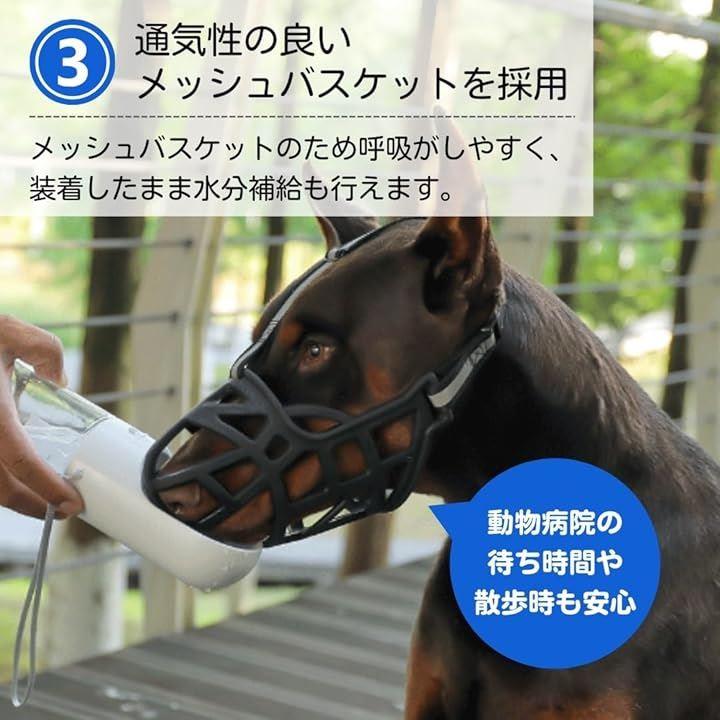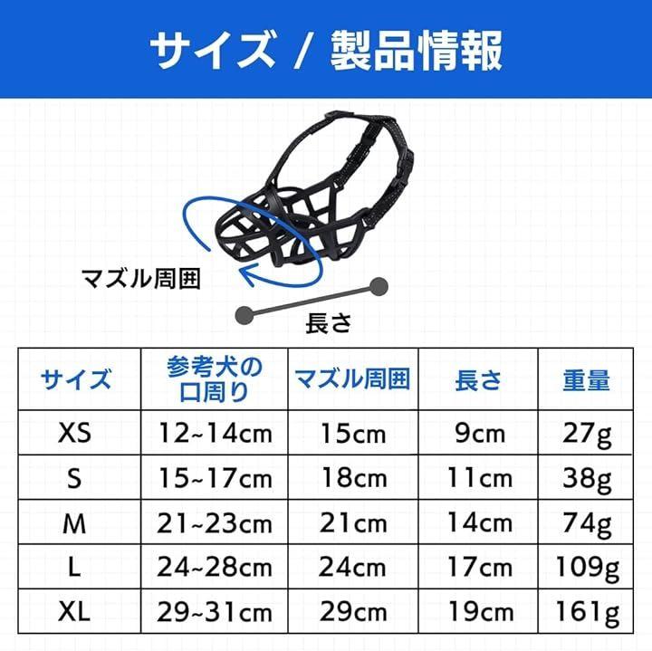 「サイズ・スペック」「サイズ」XSサイズ:参考犬の口周り=12~14cm マズル周囲=15cm 長さ=9cm 重量:27gSサイズ:参考犬の口周り=15~17cm マズル周囲=18cm 長さ=11cm 重量:38gMサイズ:参考犬の口周り=21~23cm マズル周囲=21cm 長さ=14cm 重量:74gLサイズ:参考犬の口周り=24~28cm マズル周囲=24cm 長さ=17cm 重量:109gXLサイズ:参考犬の口周り=29~31cm マズル周囲=29cm 長さ=19cm 重量:161g「バリエーション」XS、S、M、L、XL