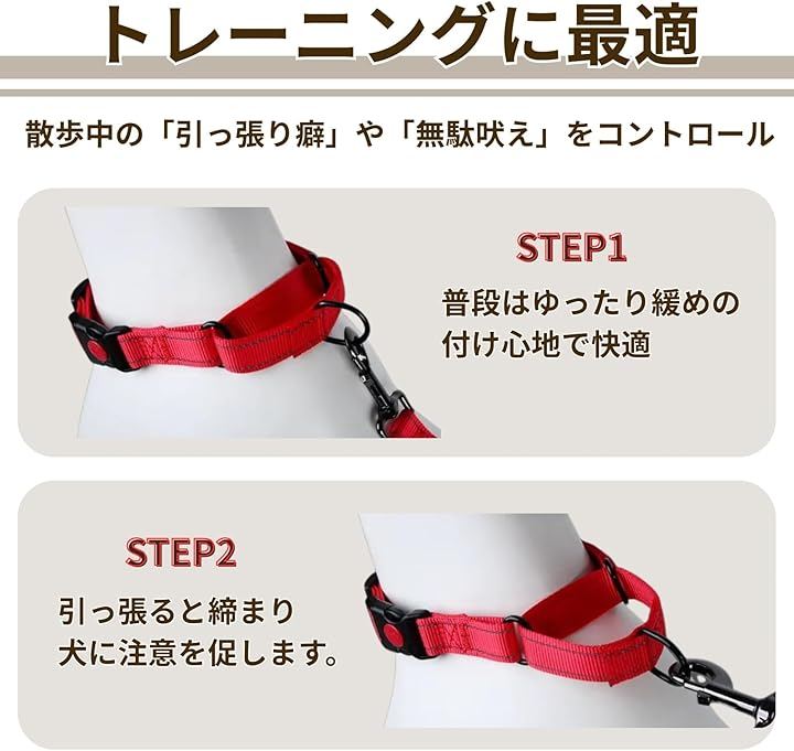 「引っ張り防止に」犬が引っ張ると首輪が締まって注意を促し、自然に引っ張り癖を抑える設計です。
