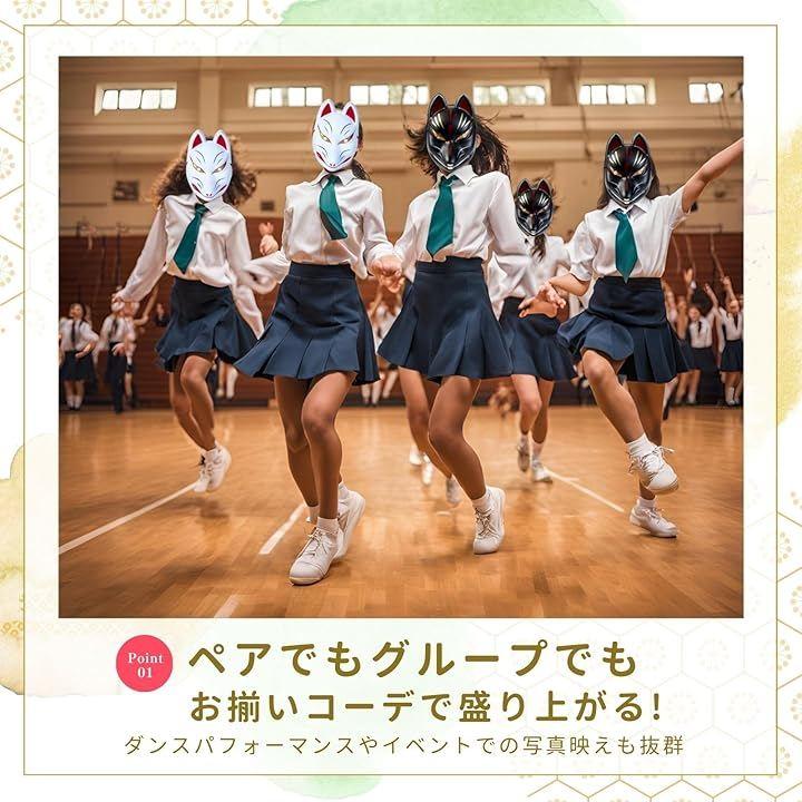 狐のお面は、ペアでも大勢でも楽しめる:ペアでの着用でお揃いコーデを楽しんだり、友人やグループで揃えてかぶることで、ダンスパフォーマンスやイベント、パーティーを盛り上げること間違いなし。