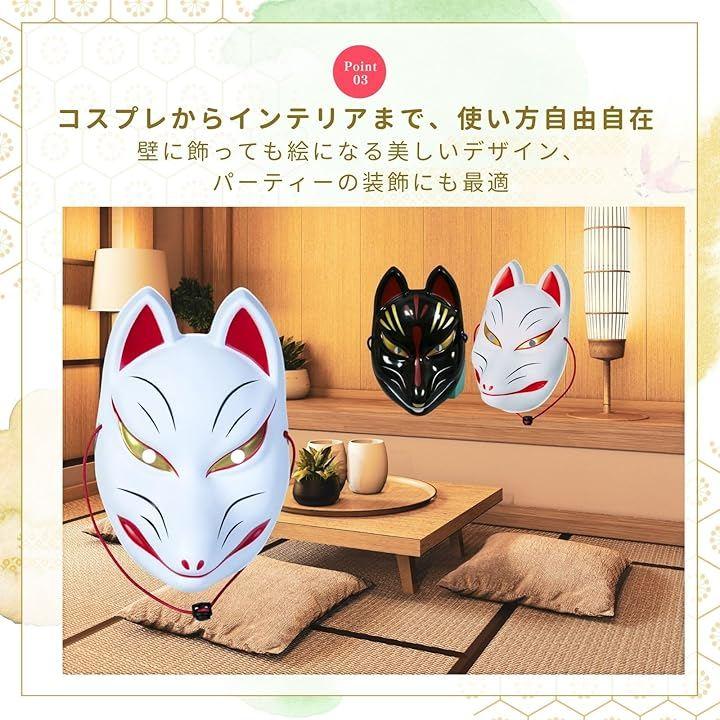 キツネお面は、幅広い用途での活用が可能:コスプレやイベントの仮装はもちろん、インテリアとしても楽しめる美しいデザイン。
