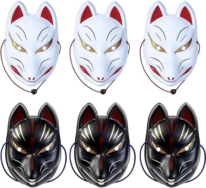 狐面 イベントを彩る魅力的なデザイン:黒と白のきつねの面セットは、コスプレ、ハロウィン、夏祭り、文化祭、仮装など多彩なイベントで存在感を発揮。