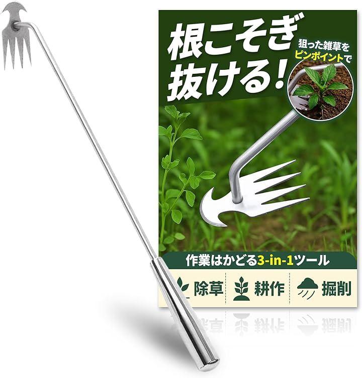 「多用途に使えるガーデンツール」この除草ツールは、雑草の除去だけでなく、土の掘り起こしや表面をならす作業にも活用できます。