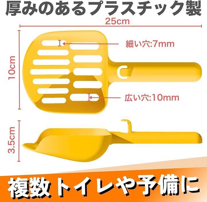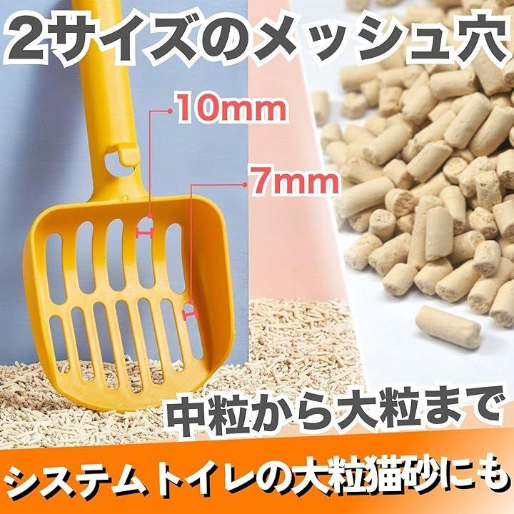 広めの幅7mmと10mmの2種類のメッシュ穴を備え、中粒から大粒用まで多様な猫砂に対応する猫用スコップです。