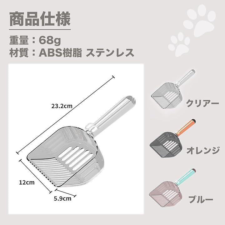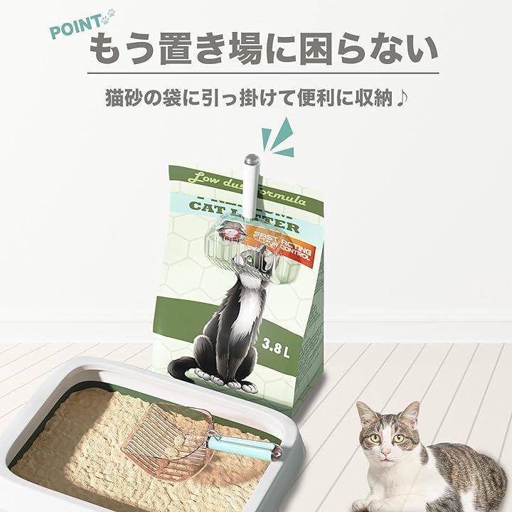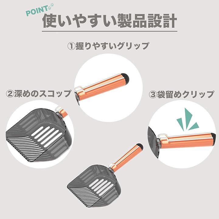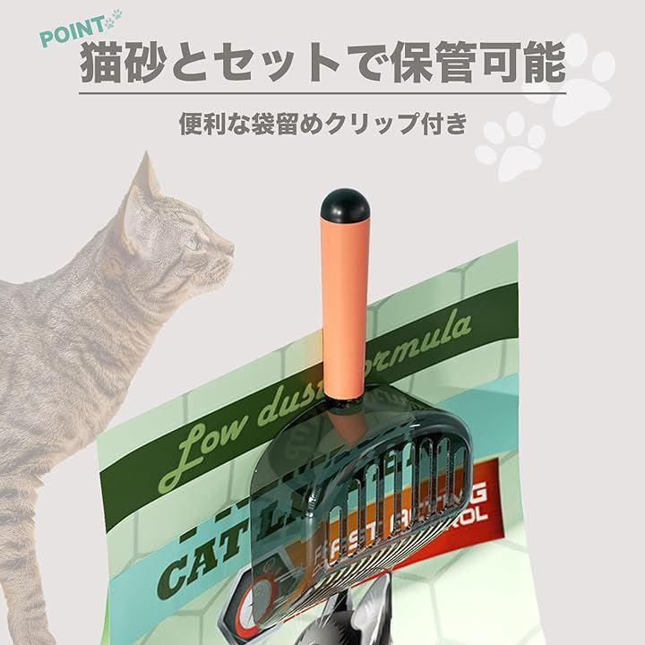 「猫砂スコップの置き場に困っている方にオススメ」猫砂の袋口を留めるクリップ付きの猫砂スコップです。