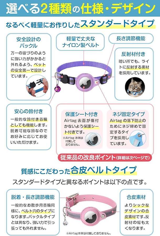 脱着可能な鈴付き、暗いところでもライトに反射して光る首輪、子猫・小型犬でも着用できる柔らかいタイプの素材の採用と、エアータグ追跡機能に限らず、機能性の高い設計です。