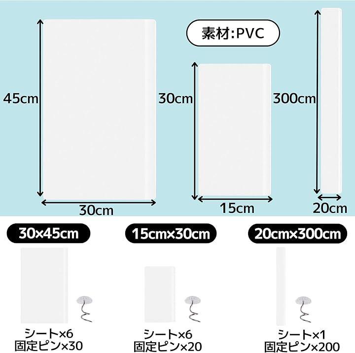 「仕様」 (1)サイズ:30x45cm、素材:PVC、セット内容:シートx6、固定用ピンx30、(2)サイズ:20x300cm、素材:PVC、セット内容:シートx1、固定用ピンx200、(3)サイズ:15x30cm、素材:PVC、セット内容:シートx6、固定用ピンx20