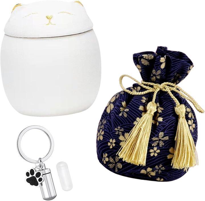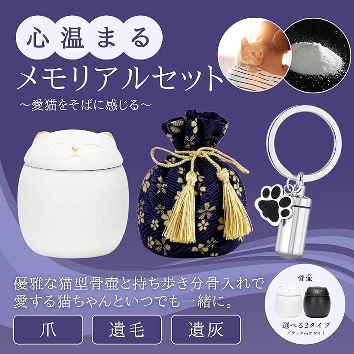 サイズとセット内容:猫 骨壷x1(高さ8.2cm 幅7.3cm 容量200ml)、保護袋x1(高さ13cm 底部の幅9.9cm)、キーホルダー型の遺骨入れx1(分骨入れ高さ2.8cm 幅1.1cm 上部リング直径2.5cm) 骨壷は、白猫と黒猫の2週類からお選びいただけます。
