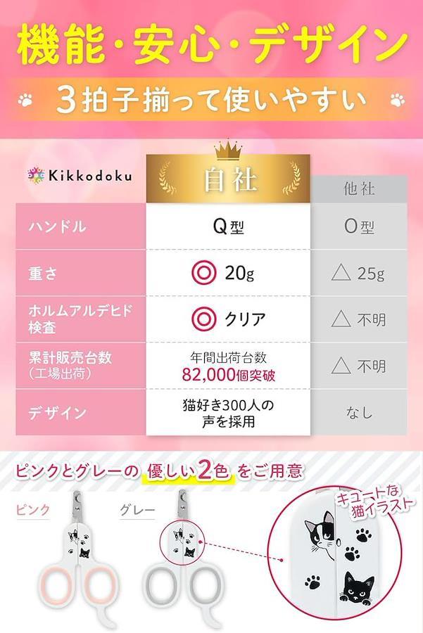 「猫好き300人の声を形に」 収納しやすいコンパクト設計、力を入れやすいグリップ、可愛い猫イラスト付き。