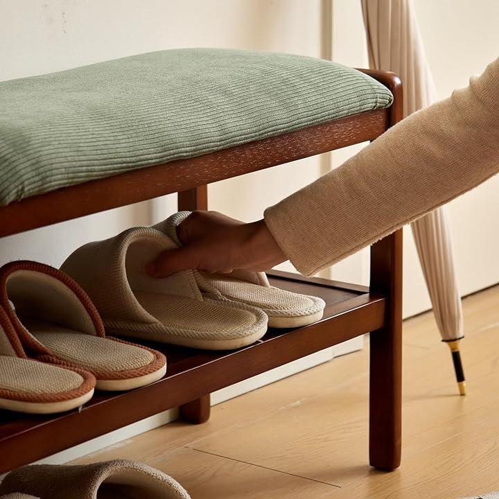 「収納棚付き玄関ベンチ」脱ぎ履きが大変な靴やブーツも楽々な玄関ベンチ、天板下は収納スペースとして有効活用いただけます。