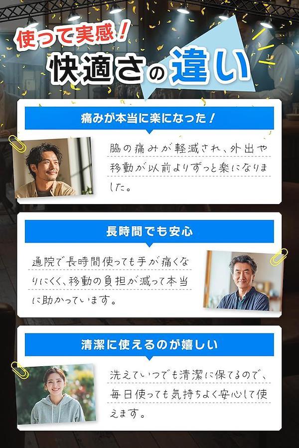 衝撃をしっかり吸収し、長時間の使用でも痛みや違和感を感じにくく、歩行や移動を快適にサポートします。