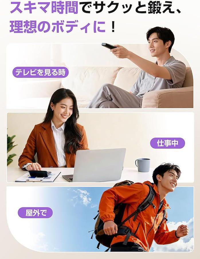 たった 5 分のスキマ時間で気軽にながらトレーニング、面倒な置き場所の悩みもなく、手間なしでトレーニングを習慣化。