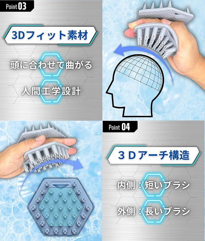 「3Dアーチ構造」内側は短いブラシ、外側は長いブラシを採用。すべてのブラシが頭皮に密着。