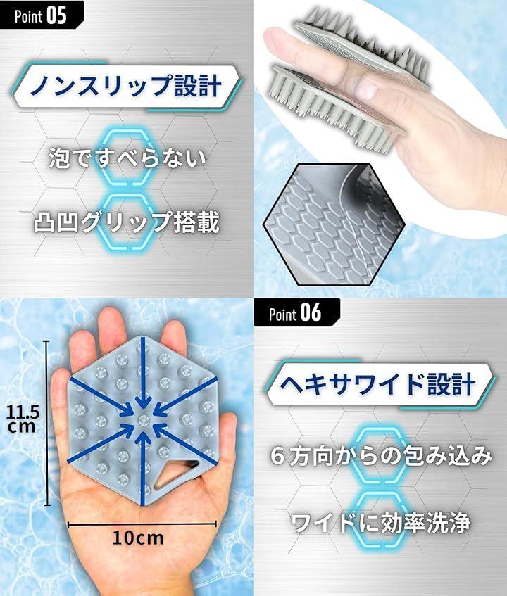 「ノンスリップ設計」指で挟んでロック。凹凸グリップ搭載。泡で滑らないシャンプーブラシ。