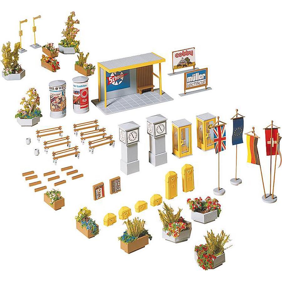 セット内容:電話ボックス、ポスト、ポスター看板、時計、花壇、バス停、ベンチ、くずかご、他