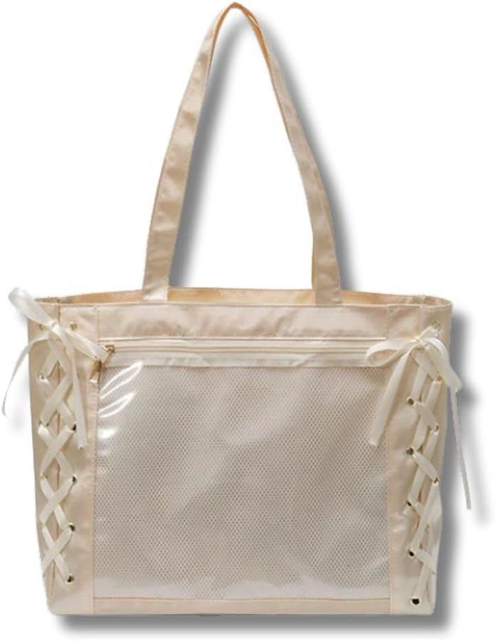 「華やかなリボンデザインで魅せるトートバッグ」サイドにあしらわれたレースアップのリボンが印象的な、女性らしいトートタイプの痛バッグです。
