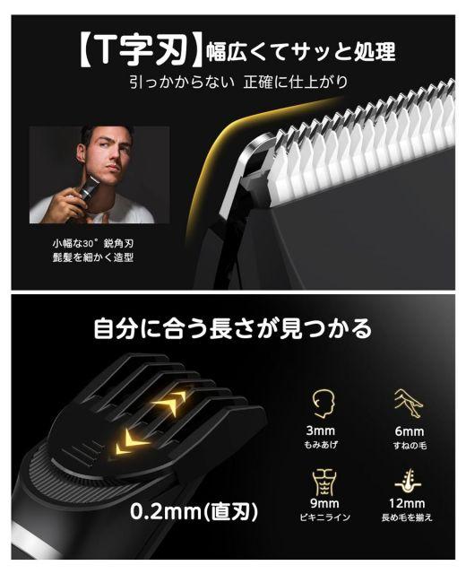 【広範囲むだげ処理・長さ調節T字刃】幅広のT字ヘッドは少ない回数で毛を素早く剃れ、毛の濃くて長い方でも、ストレスなく使い続けやすい。3mm/6mm/9mm/12mm長さ調整が可能なアタッチメントが揃っており、バリカンのようにもみあげ、えりあし、あごヒゲなど思い通りにカット。剃りだけでなく、初心者でも楽々と理想の体毛整えを実現できます。