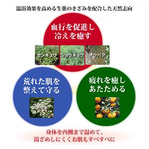 ■商品の特徴・無機温泉成分である、炭酸水素ナトリウムに加え、温浴効果を高める生薬「トウキ」「オウバク」「チンピ」のきざみを配合しました。・入浴剤の有効成分が温浴効果を高め、冷え症、疲労回復、肩のこり等に効果的です。また、血行を促進し身体を良く温め発汗を促します。・保湿成分でしっとりなめらかな湯上がり感。・お湯は緑色系の白濁湯で香りはさわやかな柑橘系です。