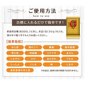 ■使用方法/召し上がり方家庭用浴槽(約200L)に対し、本品1包(30g)を入れ、湯の中で軽く手でもんでお使いください。