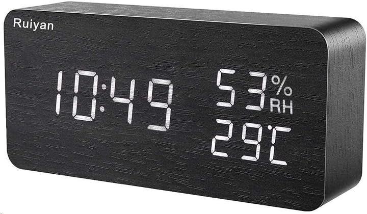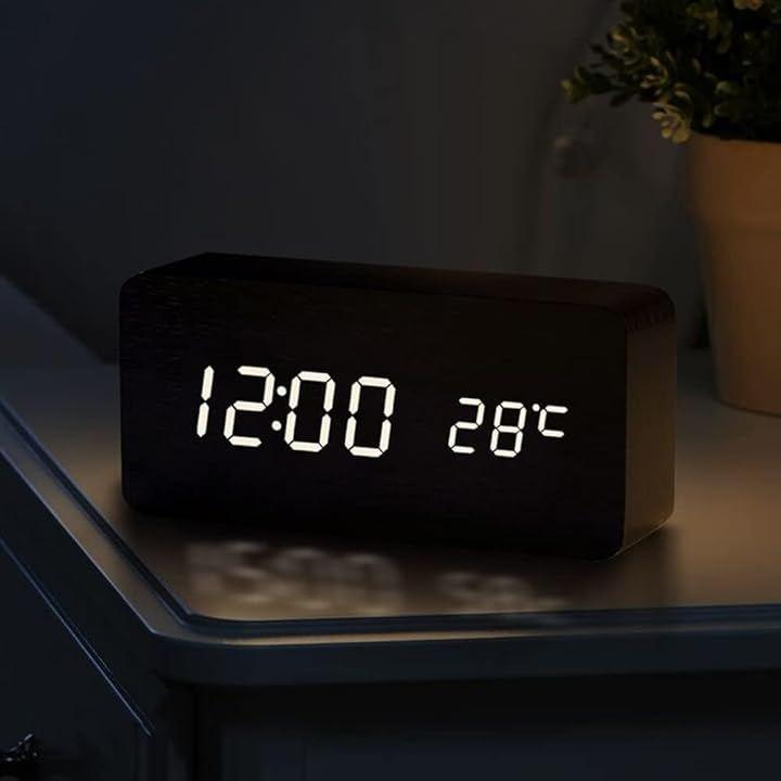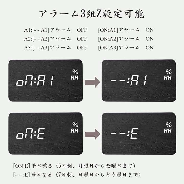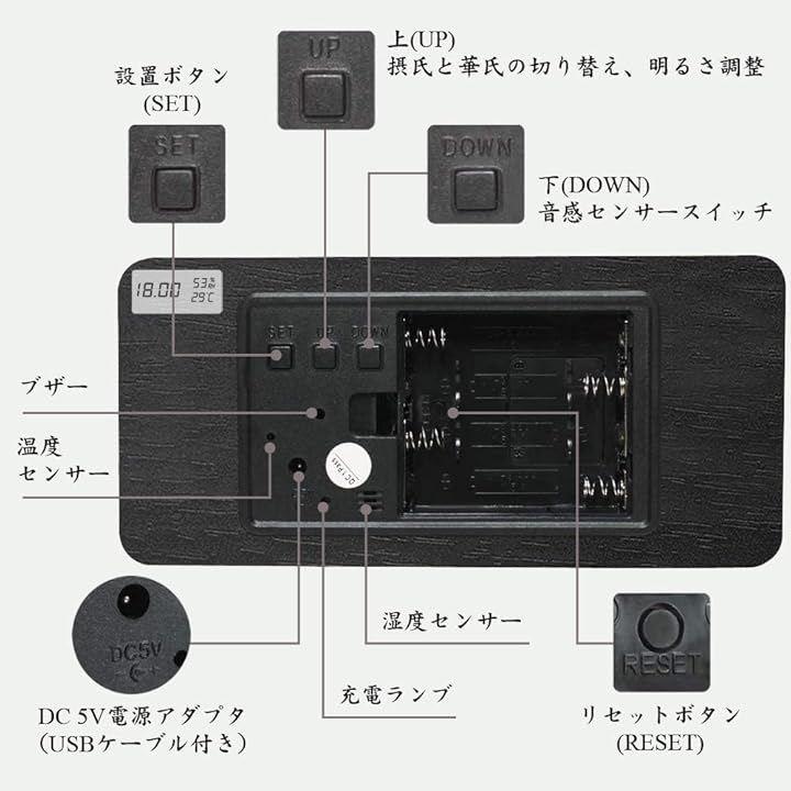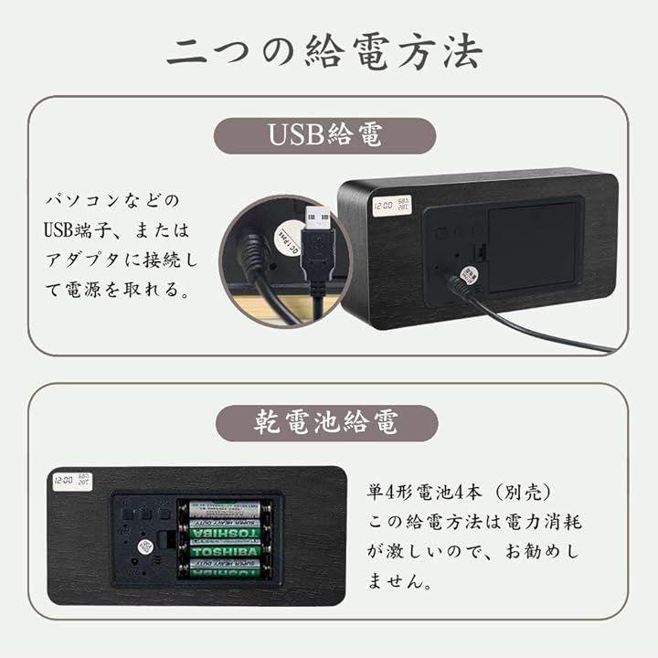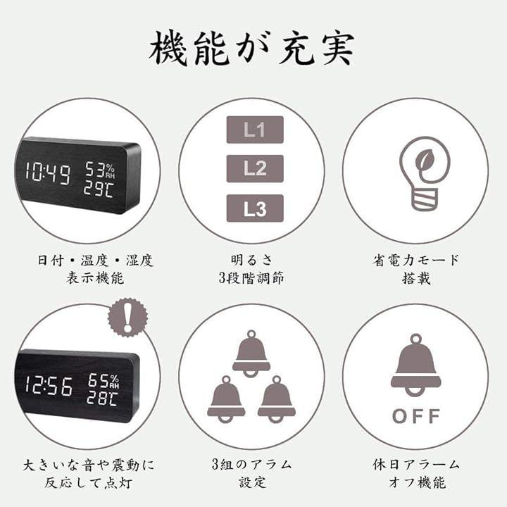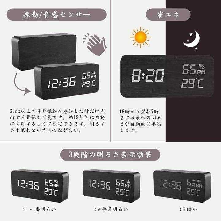 サイズ:15x7x4CM 目覚まし時計 置き時計 LEDデジタル時計 アラームクロック 温度湿度計 カレンダー 音声感知 USB/乾電池給電 ブラック