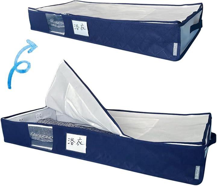 「商品仕様」サイズ/約幅93x奥行41x高さ14cm重量:約570g(底板含む) カラー/ホワイトx藍色 内容/1個 収納目安/着物(浴衣) 約3~4枚・帯など和装小物も一緒に 材質/ポリプロピレン・活性炭シート(前面) *洗えません 生産国:中国
