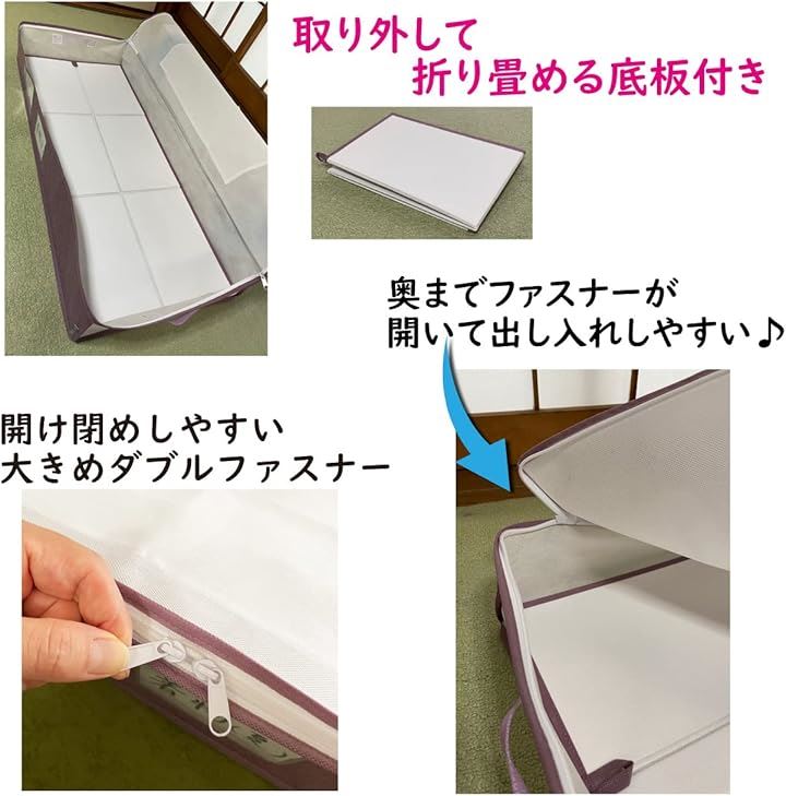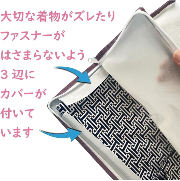 大きく開くファスナーで着物の出し入れがカンタンです。