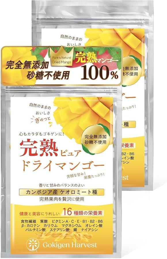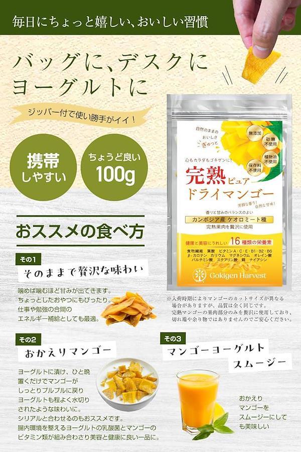 <商品説明> *内容量:100 g(チャック付き) *ブランド:Gokigen Harvest *商品:完熟ピュアドライマンゴー *原材料:マンゴー(カンボジア産ケオロミート種) *特徴:砂糖不使用。