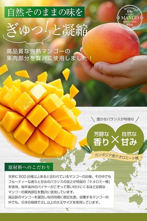 「芳醇な香りと自然な甘みを凝縮した完熟マンゴーを贅沢に使用」カンボジア産ケオロミート種の完熟マンゴーの果肉部分を贅沢に使用。