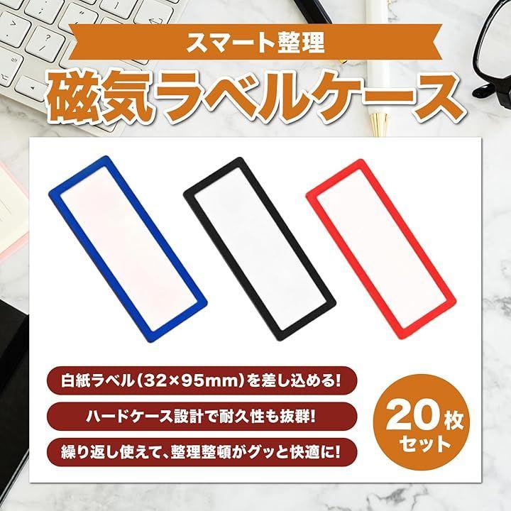 「商品内容」磁気ラベルケース20枚セット「カラー」 黒・赤・青「サイズ」外寸:約4x10cm/ラベルサイズ:32x95mm「素材」プラスチック*透明カバーには保護フィルムが付いています。