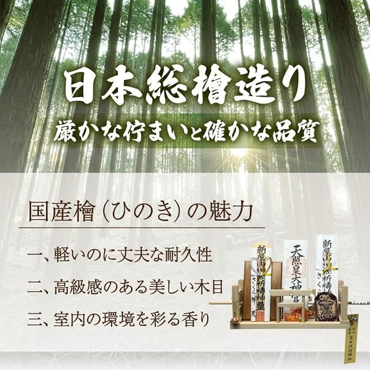 「神棚の仕様」素材:日本檜(ヒノキ) サイズ(約)縦12.5cmx横33cmx奥行10.7cm 重量:(約)445g お届け時に箱から出してすぐにお祀り頂ける完成品。
