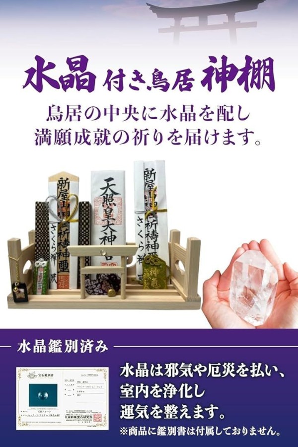 底板中央には神聖なる浄化の石「水晶」を配した本格神棚で、底板部分に3本の溝があり、御札を縦横に数枚お祀りする事が出来きます。