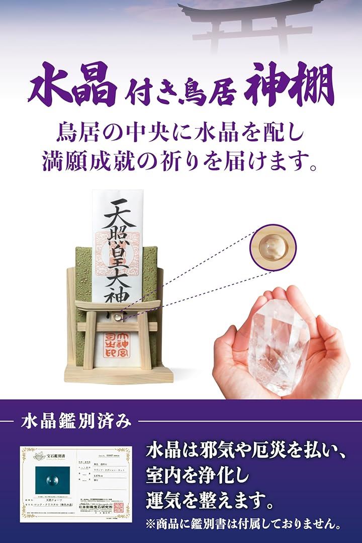 「明神・みょうじん」鳥居は、最上部の「笠木」の両端が反り上がり、下にもう一本の「島木」からなる二層構造で、中央には「額束」と呼ばれる社名を示す部分があり、そこに「本水晶」を配した職人泣かせの複雑な作りです。