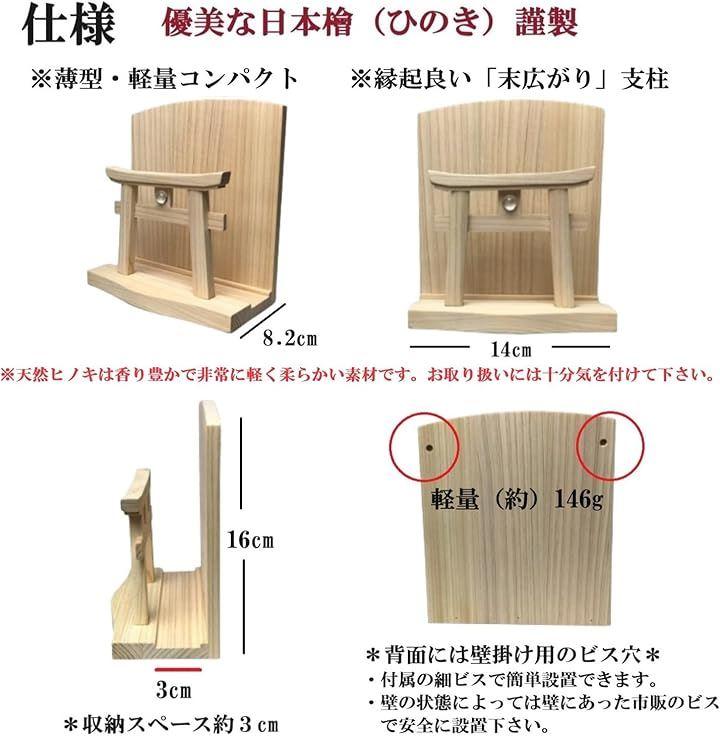 「神棚の仕様」素材:日本檜(ヒノキ) サイズ(約)縦16cmx横14cmx奥行8.2cm 重量:(約)146g お届け時に箱から出してすぐにお祀り頂ける完成品。