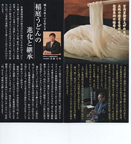 通常1-5営業日で発送80gのうどんが6束とパック入りの醤油タレが6パック紙箱に入っています。 総重量1.32kg 原材料・成分 小麦粉、でんぷん粉、食塩 使用方法 1.大きめの鍋(できれば直径21㎝以上)に たっぷりのお湯を沸騰させます。※お湯2リットルにうどん160g~200gの割合で約二人前分。2.麺どうしがくっつかないように、パラパラと散らして麺を入れます。3.うどん全体のゆで加減を揃えるため、常にうどんが鍋の中で踊る状態にし、強火で約3分ゆでます。4.ときどき箸で静かにほぐしながら、 ゆで具合を確かめてください。 うどんは手造りのため、 多少ゆで上がりが異なる場合があります。5.うどんが半透明に透き通ってきた時が最良のゆで上がりです。ただし、温麺でお召し上がりの場合は若干早めにざるに上げてください。6.ざるに上げたうどんを冷水で、もみ洗うようにしながらうどんの表面のでんぷんの「ぬめり」をよく取ります。7.さらに、氷水で完全に冷まし、うどんを引きしめます。こうすることにより、コシの強いより美味しい稲庭うどんになります。温麺も必ず氷水でしめてください。8.そして、ざるに上げ水気をよく切ります。【重要】メーカーによる商品リニューアルに伴いパッケージ(内容量も含む)変更が行われた場合、新パッケージでお届け致します事ご了承願います。