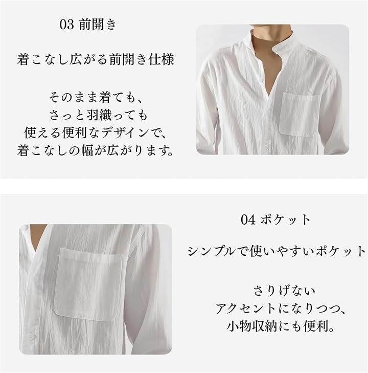 商品仕様 ・タイプ:メンズ シャツ / 長袖シャツ ・襟タイプ:スタンドカラー(バンドカラー) ・素材:薄手生地(通気性素材)100% 植物繊維(綿麻) ・シルエット:ゆったり ・ポケット:胸ポケットあり ・季節:春 / 夏 / 秋 ・カラー:ホワイト / ブラック